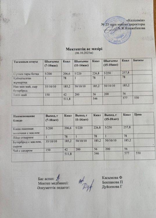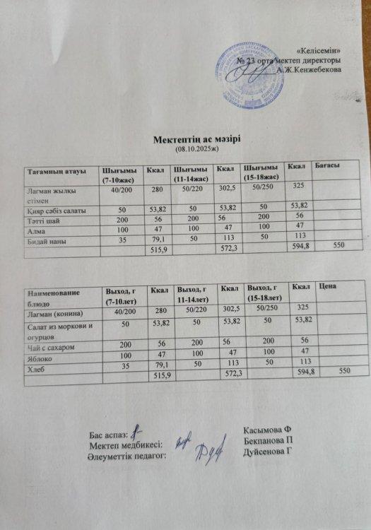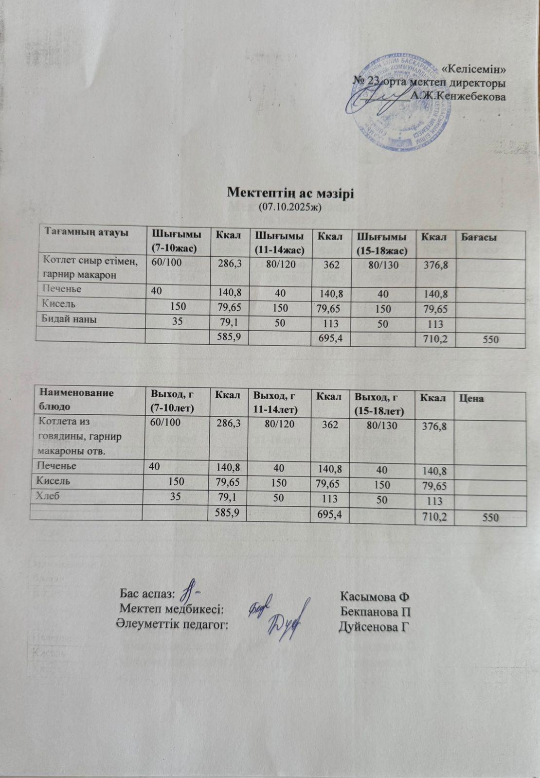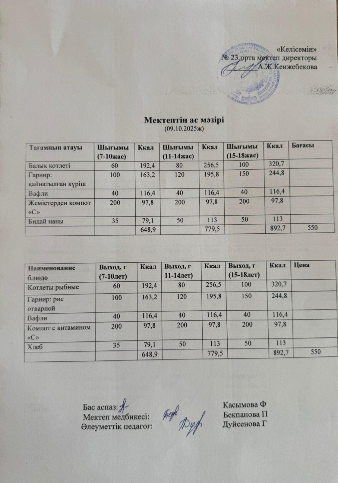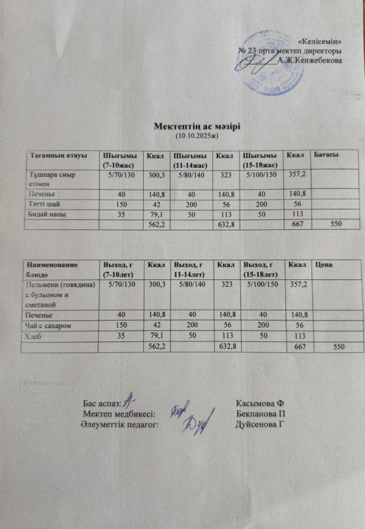 02 сентябрь 2025 Апталық меню