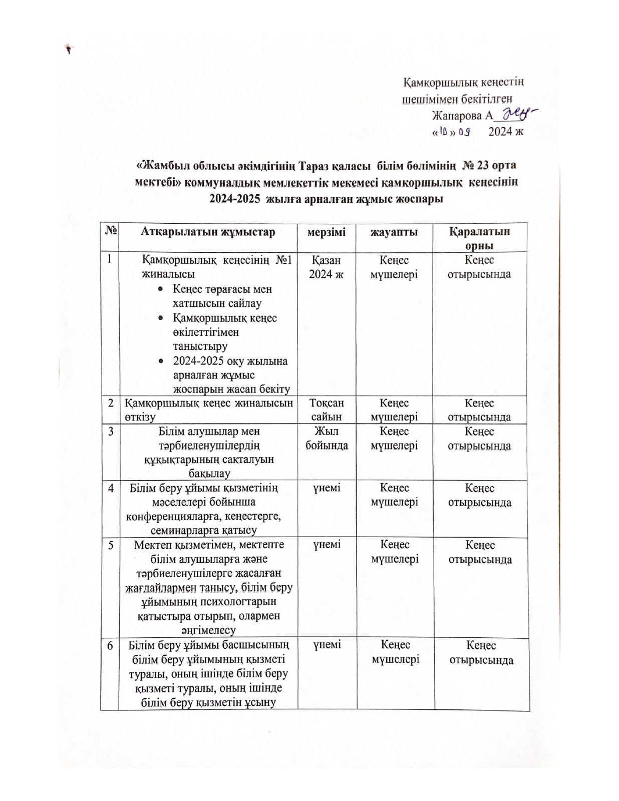 18 қараша 2024 0 1 2 3 4 5 №23 орта мектебі КММ қамқоршылық кеңесінің 2024-2025 жылға арналған жұмыс жоспары
