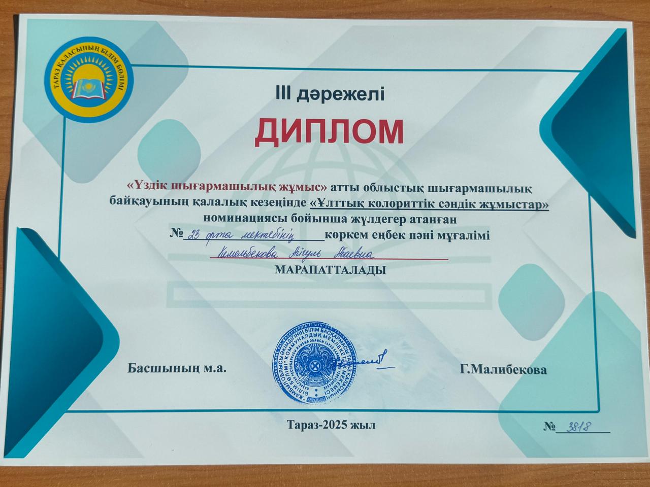 30 қазан 2025 0 1 2 3 4 5 "Үздік шығармашылық жұмыс" "Үздік шығармашылық жұмыс" атты облыстық шығармашылық байқауының қалалық кезеңінде "Ұлттық колориттік сәндік жұмыстары" номинациясы бойынша ІІІ дәрежелі жүлде иегері көркем еңбек пәні мұғалімі Кемелбекова Айгүл Абаевна марапатталады