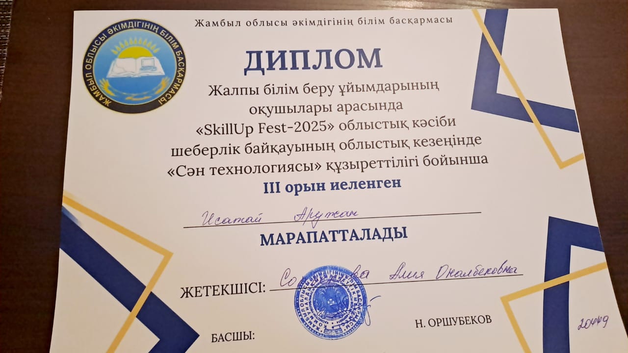 04.12.2025 жылы Жамбыл облысы әкімдігінің білім басқармасының ұйымдастыруымен өткізілген жалпы білім беру ұйымдарының оқушылары арасында өткен "SKiIIUp Fest-2025" облыстық кәсіби шеберлік байқауының облыстық кезеңінде "Сән технологиясы" құзыреттілігі бойынша 9 «Ә» сынып оқушысы Исатай Аружан ІІІ дәрежелі ДИПЛОММЕН марапатталды.Жетекшісі: кәсіптік бағдар беруші педагог Сопбекова Алия Оналбековна.