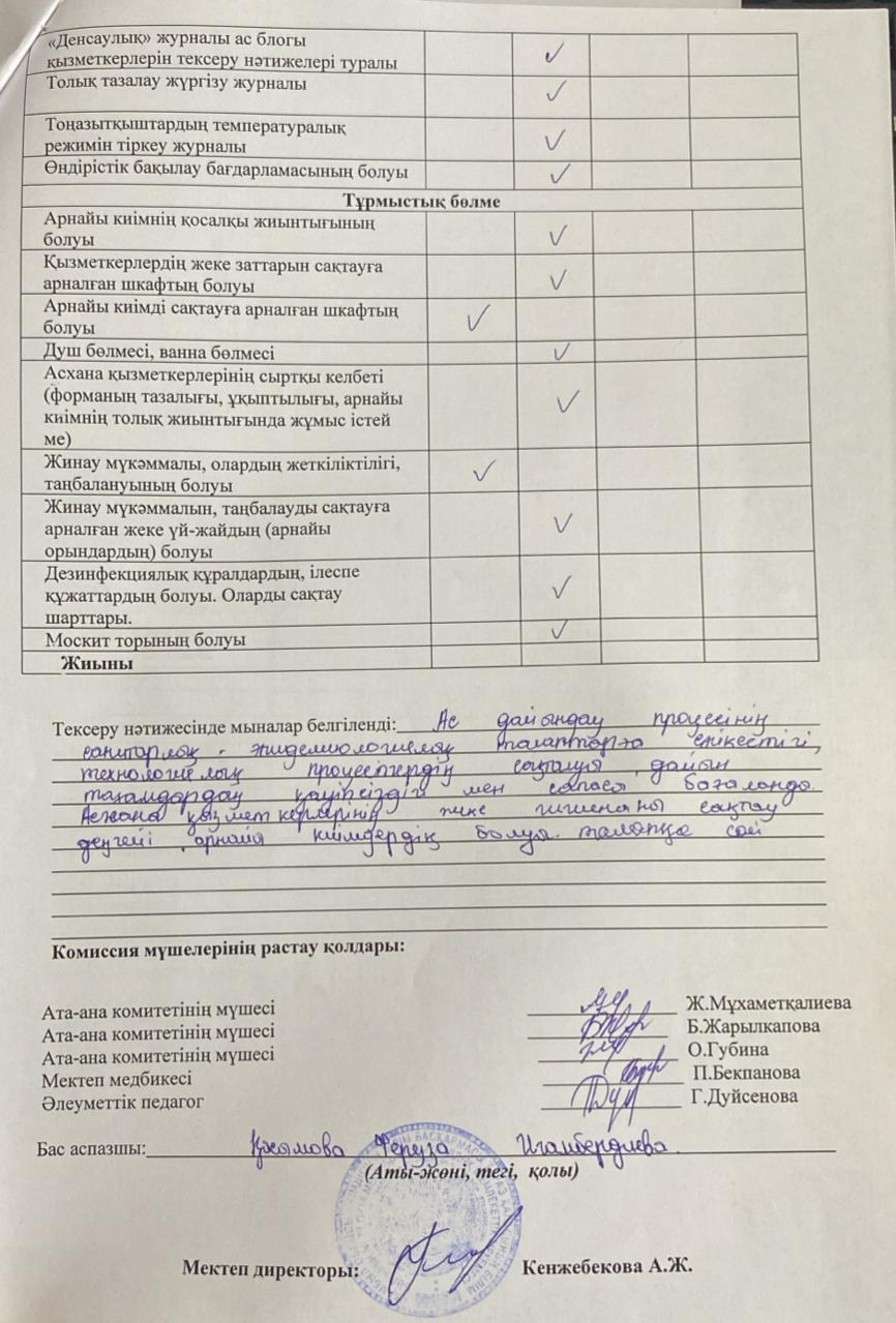 05 қаңтар 2026 0 1 2 3 4 5 Тамақтану сапасына мониторинг жүргізу бойынша бракераж комиссиясының тексеру жұмыстарының актісі