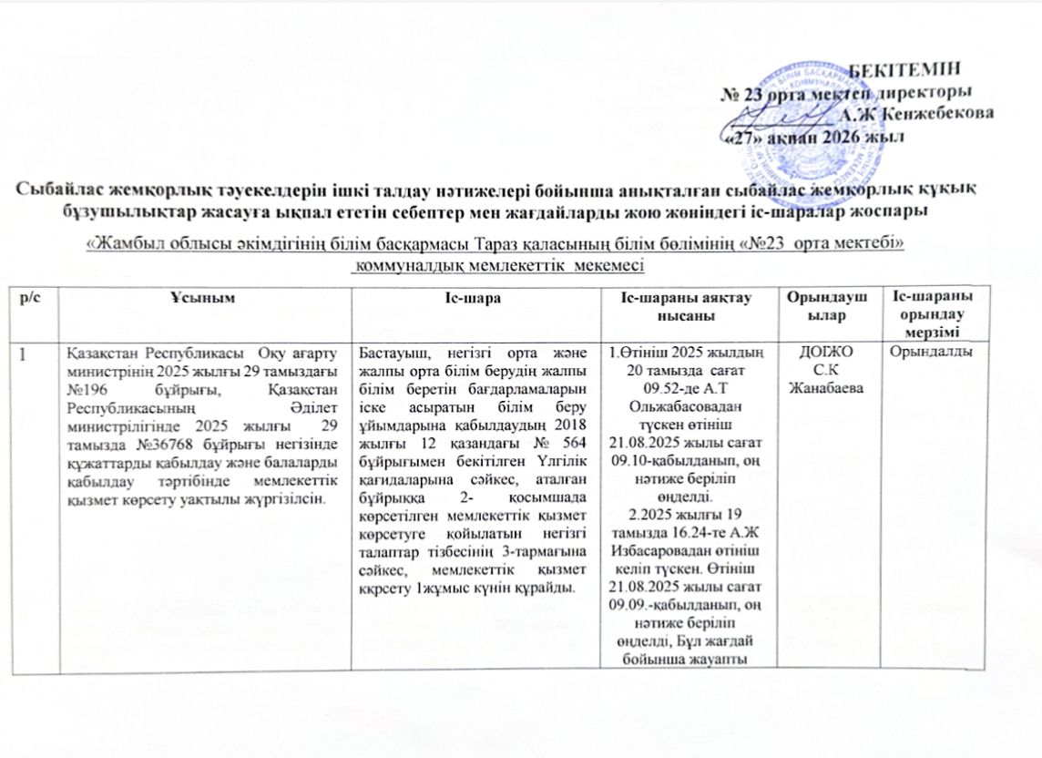 Сыбайлас жемқорлық тәуекелдерін ішкі талдау нәтижелері бойынша анықталған сыбайлас жемқорлық құқық бұзушылықтар жасауға ықпал ететін себептер мен жағдайларды жою жөніндегі іс-шаралар жоспары » СШ №23